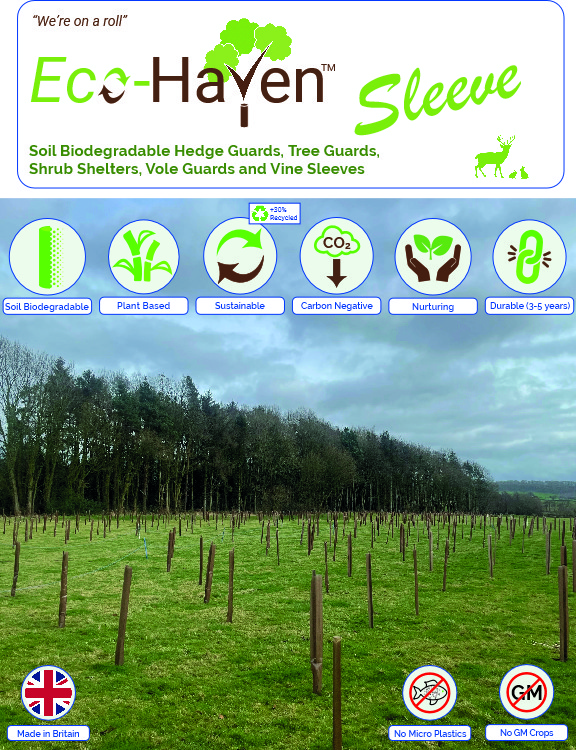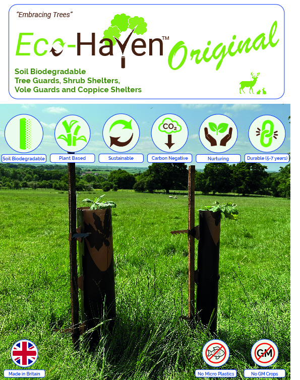Eco-Haven™, and Eco-Haven™ Sleeve, are a novel new range of biodegradable, but highly durable, protective tree guards, shrub shelters, vole guards and hedge/vine sleeves.